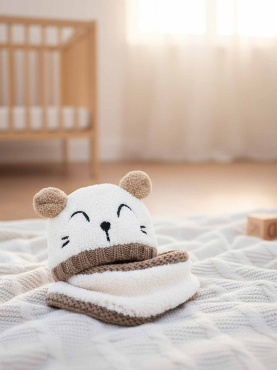 Snowy Bear Hand-Knitted Hat & Detached Scarf Set