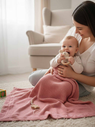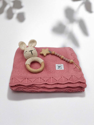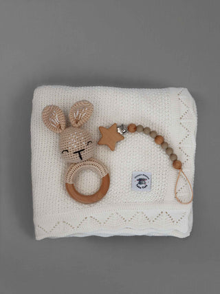 Celebrate new beginnings with our Signature 3-Piece Welcome Gift Set. This bundle combines our three most essential nursery items into one cohesive, luxury gift. Featuring the breathable warmth of our 100% cotton heirloom blanket, the sensory delight of our hand-crocheted bunny rattle, and the modern safety of our star-shaped pacifier clip, this set is designed to soothe, comfort, and delight. Each piece is crafted from natural, non-toxic materials, ensuring that the baby’s first accessories are as safe as they are beautiful.